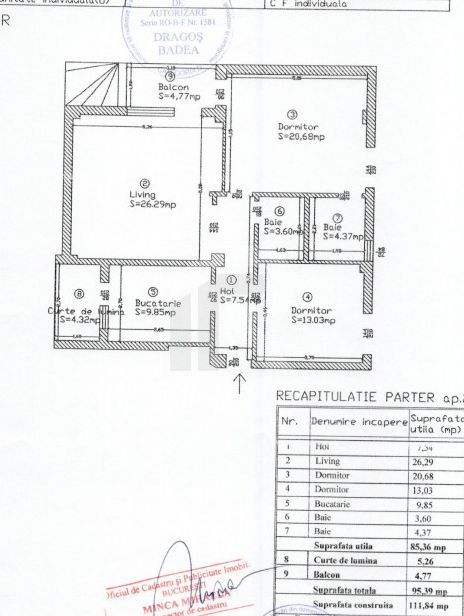 Apartamentul este ideal pentru o familie, are o suprafață utilă totală de 95mp, la care se adaugă o curte generoasă de 115 mp, perfectă pentru relaxare, și două locuri de parcare – unul în subteran și unul în fața blocului.